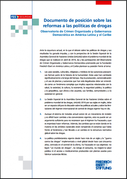 El Observatorio del Crimen Organizado y la Gobernanza Democrática para América Latina y el Caribe, auspiciado por la Friedrich Ebert Stiftung, pone en su conocimiento el documento de posición sobre las reformas a las políticas de drogas, suscrito el pasado mes de octubre en la ciudad de México D.F., el cual se adjunta a este correo en su versión en español e inglés. Este documento de posición será promovido en diferentes espacios políticos, académicos y mediáticos a partir del día 1 de diciembre de 2015.